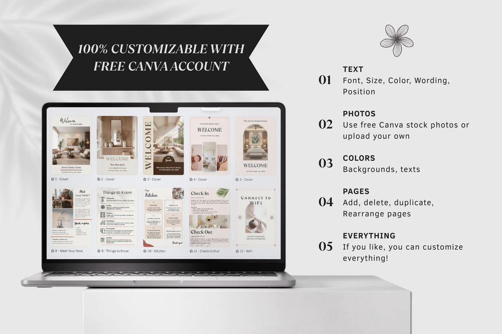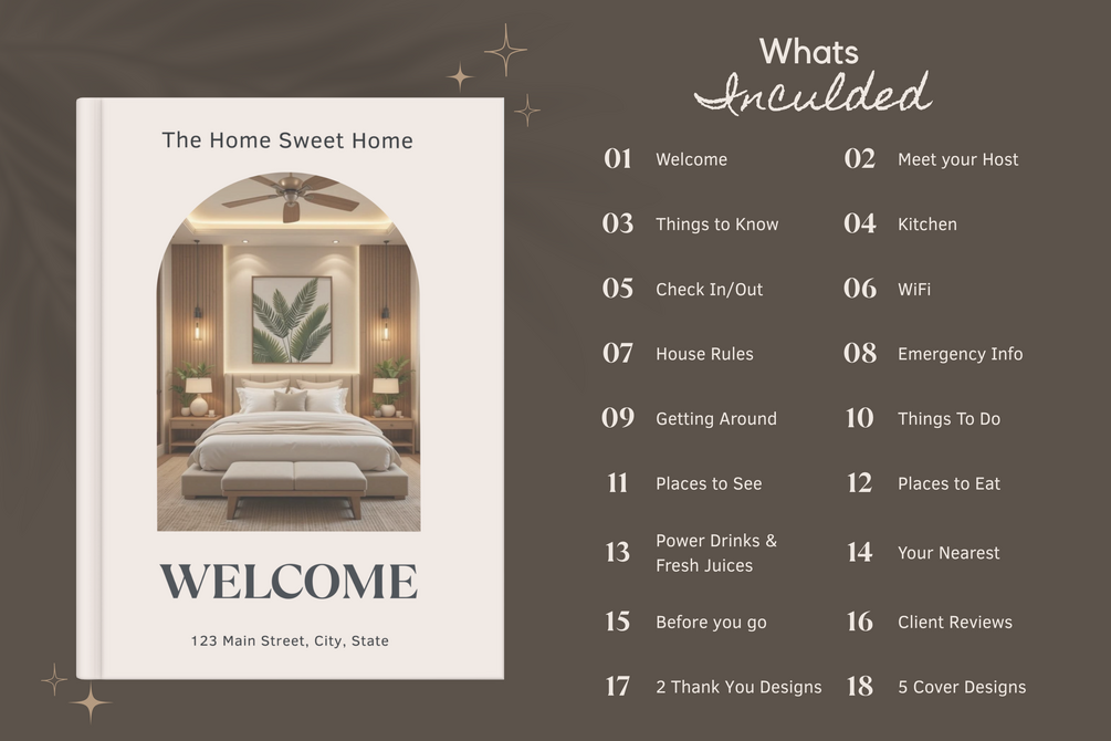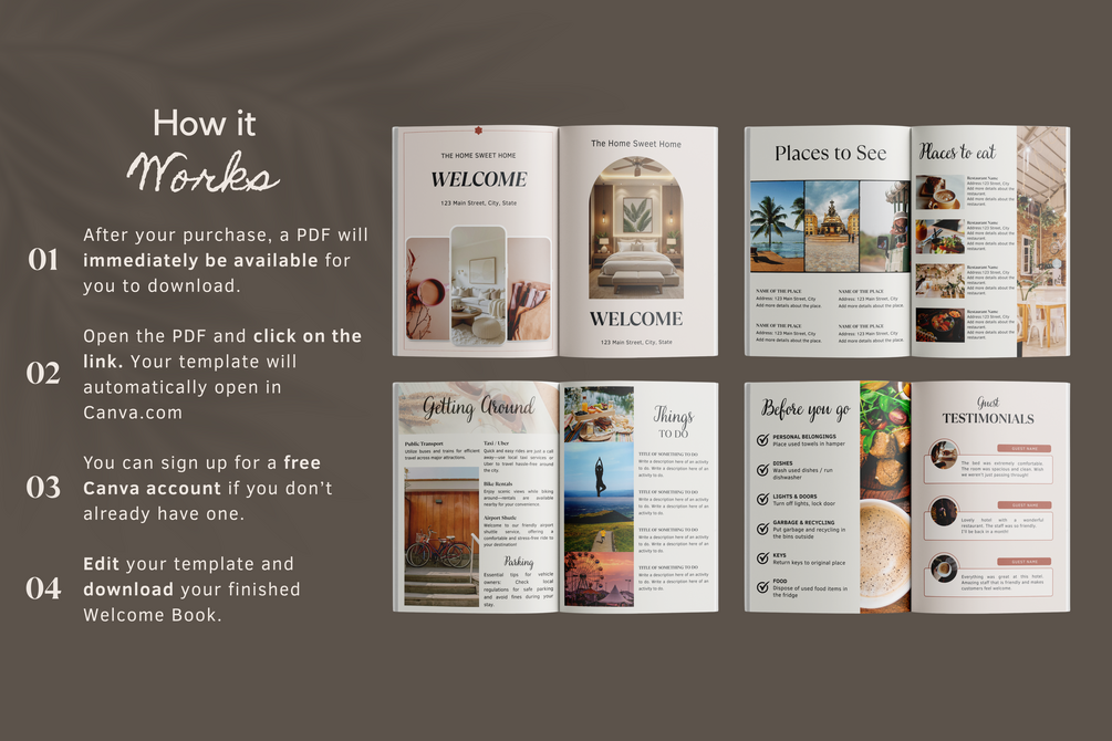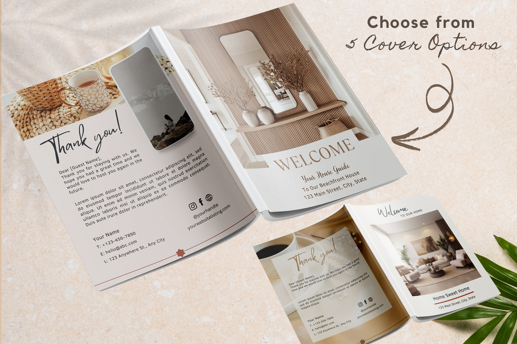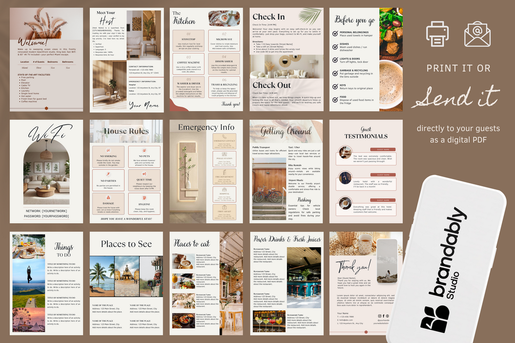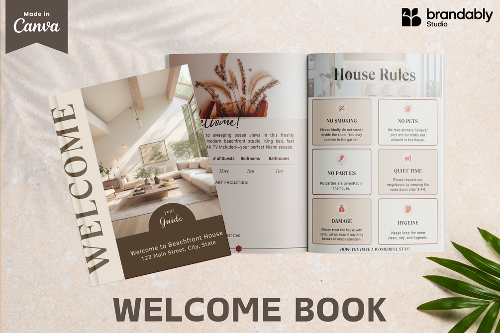 Download your Welcome Book from Canva as a PDF file. You can either print at hotel/home; or send it to a local print shop or share this welcome book digitaly with guests.